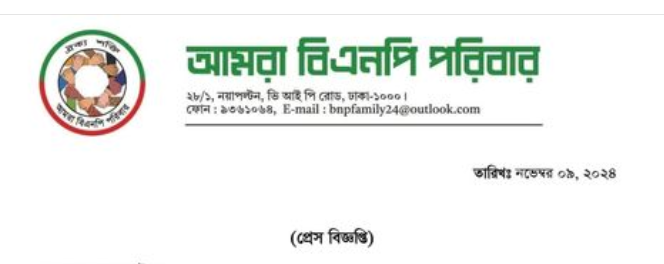আজ ৯,নভেম্বর-২৪ আমরা বিএনপি পরিবার মিডিয়া রিলিজ এ বলাহয়।