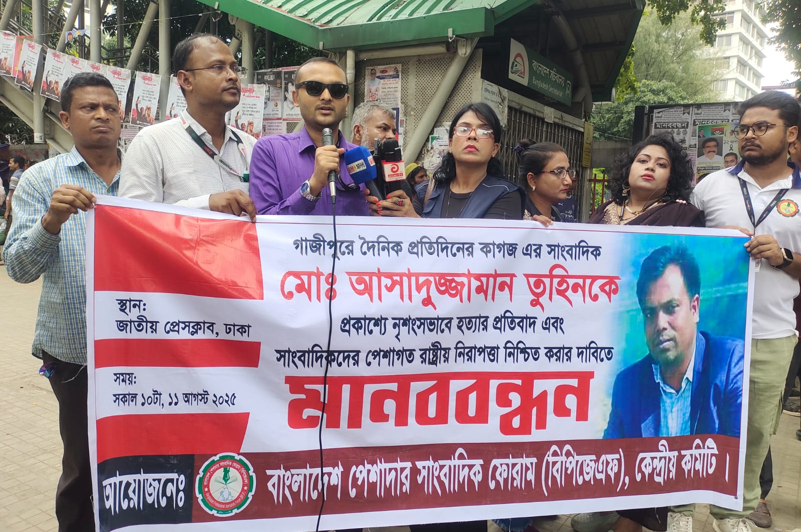 গাজীপুরে সাংবাদিক আসাদুজ্জামান তুহিনকে প্রকাশ্যে কুপিয়ে হত্যার প্রতিবাদে মানববন্ধন করেছেন বাংলাদেশ পেশাদার সাংবাদিক ফোরাম (বিপিজেএফ)। সোমবার (১১ আগস্ট) সকালে জাতীয় প্রেসক্লাবের সামনে এ কর্মসূচি পালন করা হয়। সংগঠনের কেন্দ্রীয় কমিটির সভাপতি কাজী শরিফুল ইসলাম শাকিলের সভাপতিত্ব ও সাধারণ সম্পাদক রোমান আকন্দ’র সঞ্চালনায় মানববন্ধনে বক্তব্য রাখেন, বিপিজেএফ'র উপদেষ্টা ও আমাদের সময়ের সিনিয়র সহ-সম্পাদক মোহাম্মদ আখতারউজ্জামান, বাংলাদেশ জাতীয় পার্টি-বিজেপির সাংগঠনিক সম্পাদক নুরুজ্জামান হীরা, এনডিপির মহাসচিব মঞ্জুর হোসেন ঈসা, উজ্জ্বল ভূইয়া, জাকিয়া হোসেন, হাফিজ উদ্দিন, মাহমুদুল হাসান, রেজায়ে রাব্বি রেজা, মরিয়ম আক্তার মারিয়া, সুজন মাহমুদ প্রমূখ।