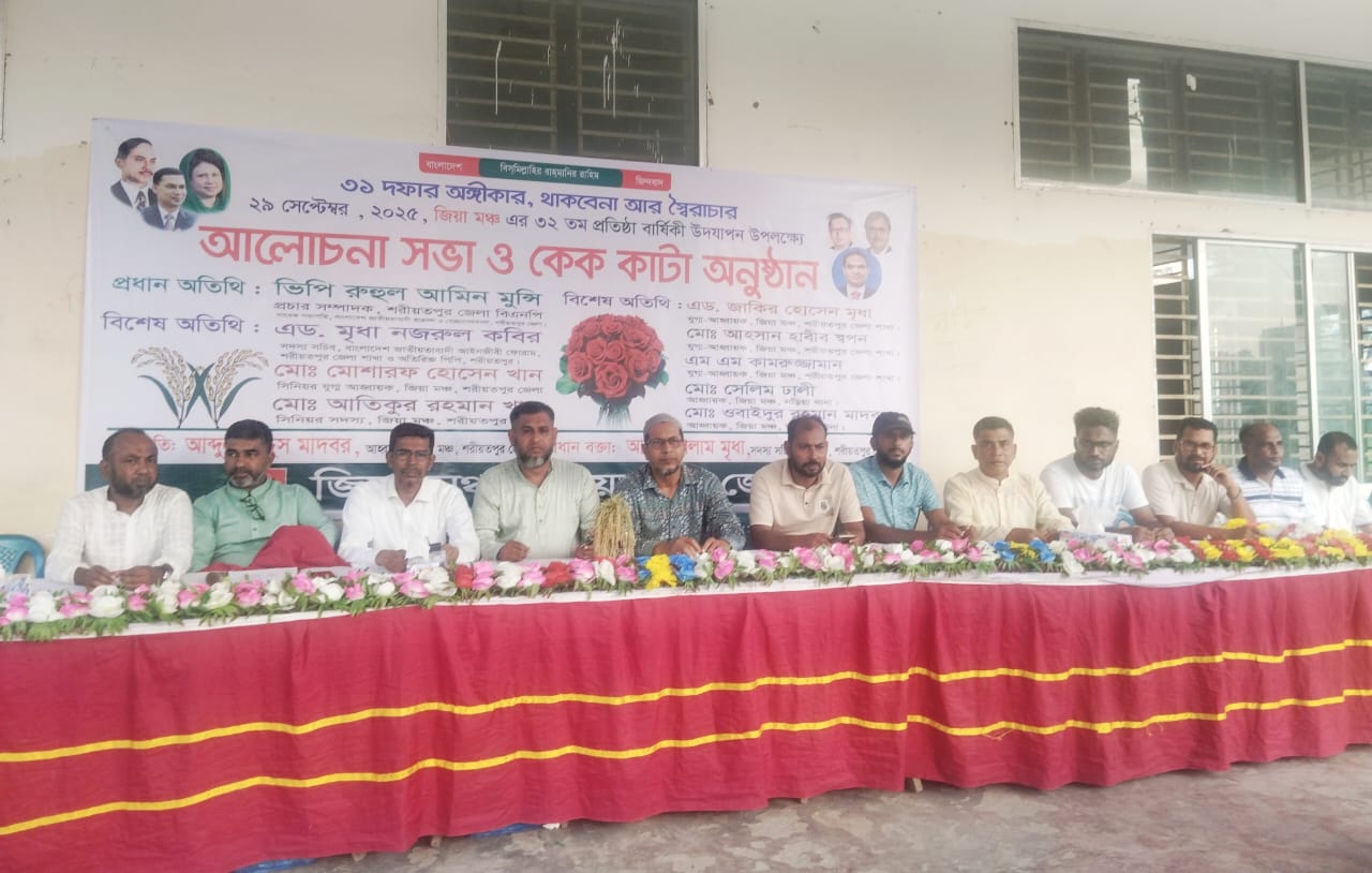 "৩১ দফার অঙ্গীকার, থাকবেনা আর স্বৈরাচার" এই শ্লোগানে শরীয়তপুরে জিয়া মঞ্চের ৩২তম প্রতিষ্ঠাবার্ষিকী পালিত হয়েছে। এউপলক্ষ্যে সোমবার (২৯ সেপ্টেম্বর ২০২৫) বিকালে শরীয়তপুর পৌরসভার হলরুমের সামনে আলোচনা সভা ও কেককাটা অনুষ্ঠানের আয়োজন করা হয়।