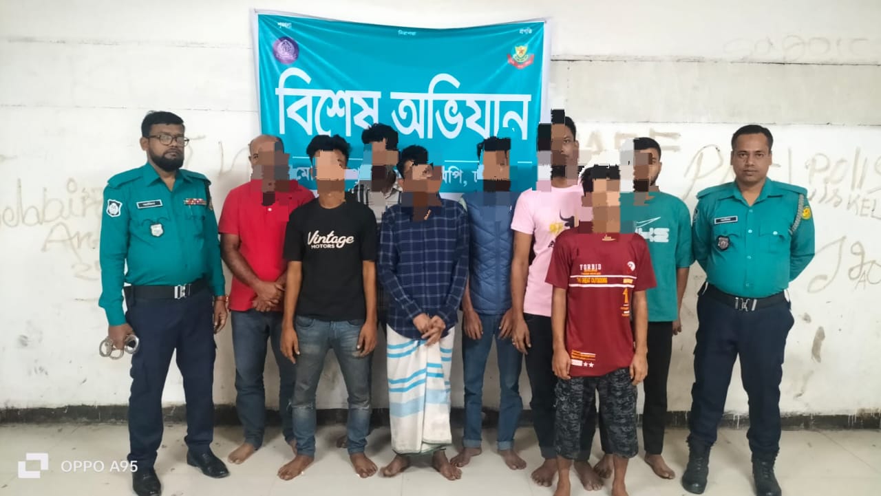 গ্রেফতারকৃতরা হলো-১। মোবারক আরিফ (৩৯) ২। নাঈম (২৫) ৩। রবিন (২৪) ৪। ইমরান (৪৪) ৫। কুরবান (৪৫) ৬। রাসেল সুমন (২৮) ৭। ইসমাইল (২০) ও ৮। মিন্টু (৩৫)। গ্রেফতারকালে তাদের হেফাজত হতে ২ কেজি ৫০০ গ্রাম গাঁজা উদ্ধার করা হয়।
