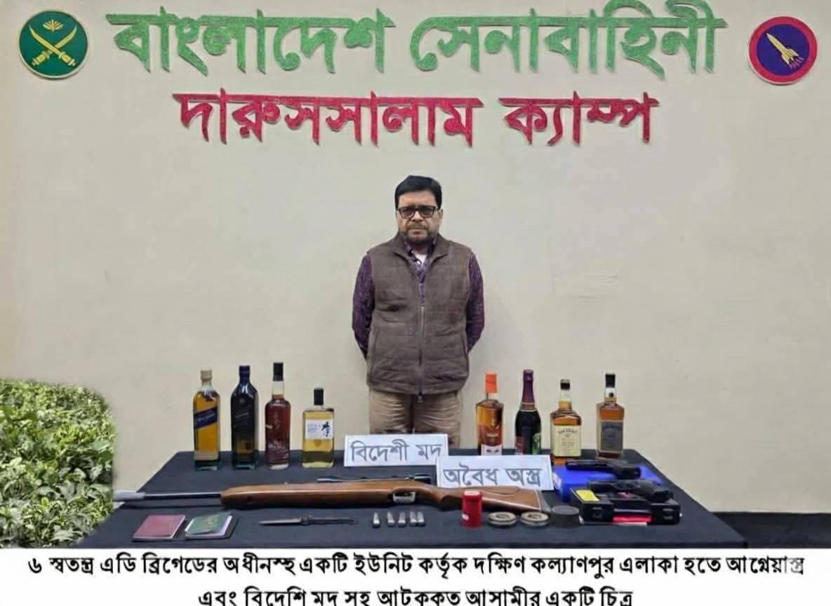 সেনাবাহিনীর একটি সূত্রে জানা গেছে, শনিবার ভোরে গোয়েন্দা তথ্যের ভিত্তিতে দক্ষিণ কল্যাণপুরের ইস্টার্ন হাউজিংয়ে যৌথ অভিযান চালায় সেনাবাহিনীর একটি দল। অভিযানে আটক নাসির উদ্দিনের কাছ থেকে একটি রাইফেল, দুটি বিদেশি পিস্তল এবং বিদেশি মদসহ বিভিন্ন সরঞ্জামাদি জব্দ করা হয়।