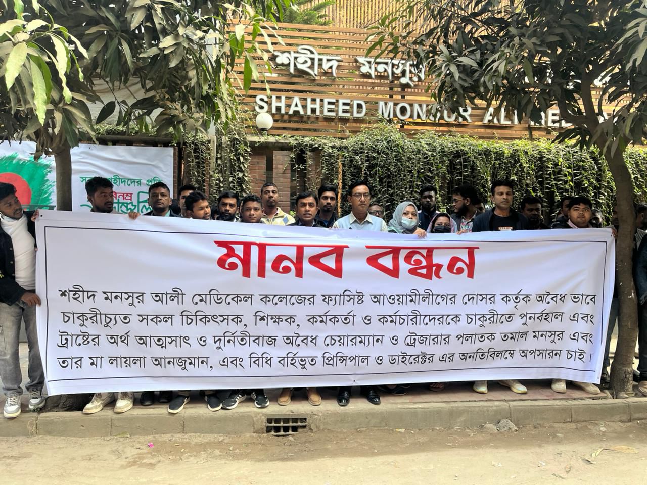 মানববন্ধনে অংশগ্রহণকারীরা অভিযোগ করেন, শহীদ মনসুর আলী মেডিকেল কলেজ ট্রাস্টের সঙ্গে সংশ্লিষ্ট ফ্যাসিবাদী আওয়ামী লীগের দোসর একটি চক্র দীর্ঘদিন ধরে অবৈধভাবে এবং ক্ষমতার অপব্যবহার করে প্রতিষ্ঠানটি পরিচালনা করে আসছে। তাদের স্বেচ্ছাচারী সিদ্ধান্তের ফলে নিয়ম বহির্ভূতভাবে বহু চিকিৎসক, শিক্ষক, কর্মকর্তা ও কর্মচারীকে চাকরিচ্যুত করা হয়েছে, যা সম্পূর্ণ বেআইনি ও অন্যায়।