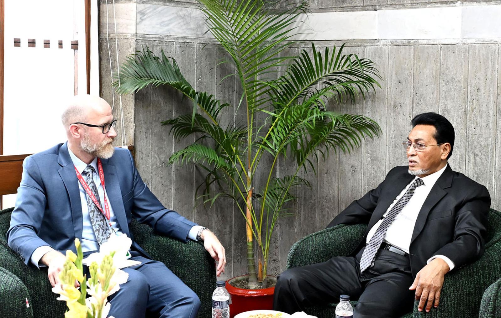 ০৬ এপ্রিল ২০২৬ বাংলাদেশ জাতীয় সংসদের চীফ হুইপ মোঃ নূরুল ইসলামের সাথে সংসদ ভবনে তাঁর কার্যালয়ে সৌজন্য সাক্ষাৎ করেন আমেরিকান দূতাবাসের রাজনৈতিক কর্মকর্তা স্টুয়ার্ট জেমস।
