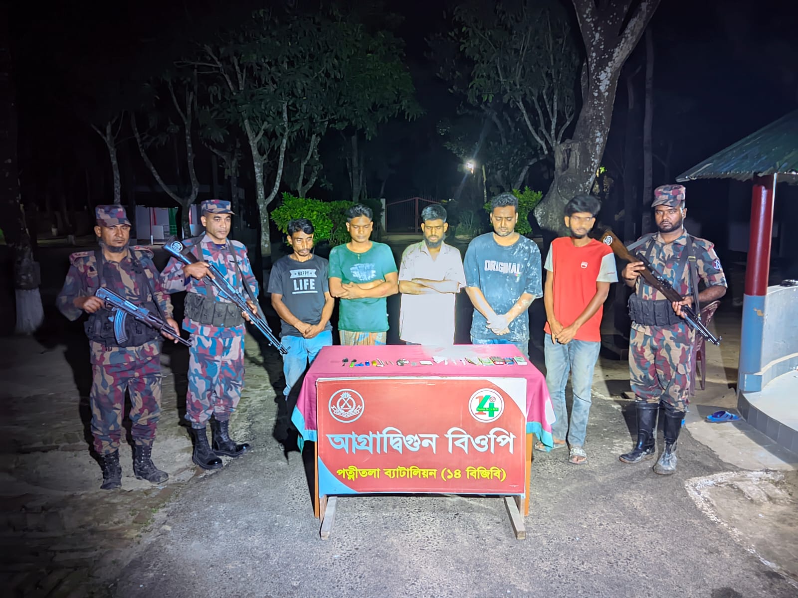 নওগাঁর ধামইরহাটে মাদক সেবনরত অবস্থায় ১১ পিস ট্যাপেন্টাডল ট্যাবলেটসহ ৫ জন মাদক কারবারীকে আটক করেছে পত্নীতলা ব্যাটালিয়ন (১৪ বিজিবি)। সোমবার (৬ এপ্রিল) ভোররাতে উপজেলার আগ্রা কালী মন্দির এলাকা থেকে তাদের আটক করা হয়। বিজিবি সূত্রে জানা গেছে, সোমবার রাত ১২টা ৫০ মিনিটের দিকে আগ্রাদ্বিগুন বিওপির টহল কমান্ডার নায়েব সুবেদার মোঃ সোয়েব আলী মুন্সীর নেতৃত্বে একটি বিশেষ টহল দল সীমান্ত এলাকায় অভিযান চালায়। গোপন সংবাদের ভিত্তিতে সীমান্ত পিলার ২৫৭/১১-আর হতে প্রায় ৩ কিলোমিটার ভেতরে বাংলাদেশের অভ্যন্তরে আগ্রা কালী মন্দির নামক স্থানে অভিযান চালিয়ে ওই পাঁচজনকে আটক করা হয়। আটককৃতরা হলেন— কাশিপুর গ্রামের জসিম উদ্দিনের ছেলে মোঃ বদিউল ইসলাম (৩৯), পাথরঘাটার মৃত আব্দুস সামাদের ছেলে মোমিনুল ইসলাম (৩২), আগ্রাদ্বিগুনের মৃত আজগর আলীর ছেলে শাহাদাত হোসেন সাগর (২৭), আগ্রা কালীতলার মান্নানের ছেলে সামুনুর রশিদ (৩৫) এবং বৈরাগিপাড়ার মৃত ধীরেন চন্দ্র মাহন্ডের ছেলে শ্রী তাপস কুমার (২৮)।