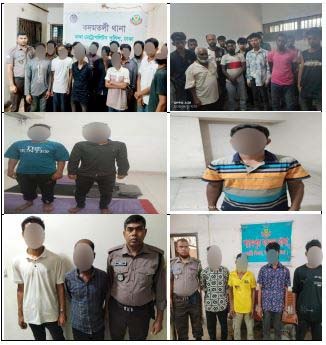 গ্রেফতারকৃতরা হলো-১। মোঃ সায়েম (২০) ২। মোঃ বিপ্লব মৃধা (২৩) ৩। মোঃ আল-আমিন ৪। মোঃ অন্তর (৩২) ৫। মোঃ রফিক (৩৬) ৬। মো; মাহিন (২১) ৭। মোঃ বাবুল হোসেন (৪০) ৮। শান্তা ৯। মোঃ বাবুল হোসেন (৪০) ১০। মালেকা (৫০) ১১। আব্দুল আলী (৬৪) ১২। জেসমিন (৪৫) ১৩। মোঃ ইমতাজুল হক ছোটন (২২) ১৪। মোঃ জহিরুল ইসলাম ইকবাল (২৪) ১৫। মোছাঃ আয়েশা আক্তার (৩০) ১৬। মোঃ শাহজালাল (৪০) ১৭। মোঃ রোকন বেপারী (২৪) ১৮। মোঃ নাহিদ (২৫) ১৯। মোঃ জীবন (২২) ২০। রাজীব ওরফে সজিব বিশ্বাস (৪০) ২১। হেলাল বেপারী ওরফে সাগর বেপারী (২২) ২২। মোঃ হৃদয় (২২) ২৩। মোঃ সাইফুল ইসলাম ২৪। মোঃ সুজন (২০) ২৫। মোঃ আরমান (২৫) ২৬। নাজমুল হাসান রিয়াজ (১৯) ২৭। মোঃ সোহাগ কাজী (১৯) ২৮। মোঃ নুর আলম (২৮) ২৯। মোঃ মৃদুল খন্দকার (২৫) ৩০। মোঃ আবুল কালাম আজাদ(৫৬) ৩১। মোঃ সুমন(২৫) ৩২। মোঃ পারভেজ হোসেন ওরফে আনাস(৩০) ৩৩। মোঃ জুয়েল রানা(৩২) ৩৪। মোঃ ইমরান(২২) ৩৫। মোঃ মিজানুর রহমান(২৮) ৩৬। মোঃ সাগর(২৭) ৩৭। বাদল মোল্লা(৩৩) ৩৮। মোঃ বিজয়(১৯) ৩৯। মোঃ সাকিম হোসেন(৩০) ৪০। মোঃ রকি(২৬) ৪১। মোঃ মাইনুদ্দিন(২০) ৪২। মোঃ ওমর ফারুক(২৫) ৪৩। মোঃ নাঈম ৪৪। মোঃ আলাউদ্দিন ৪৫। মোঃ আল আমিন (৩৪) ৪৬। সাদিয়া আক্তার ওরফে বন্যা (২৮) ৪৭। শাহিনা বেগম ও ৪৮। মোঃ রাকিব (৩০) ।