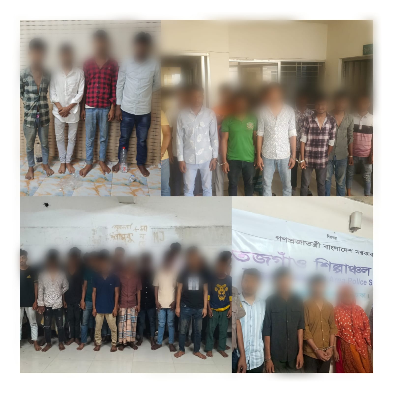 গ্রেফতারকৃতরা হলো- ১। মোঃ শিপন মিয়া (২০) ২। আলমগীর হোসেন (২৯) ৩। সবুজ খান (২৫) ৪। আবির হোসেন (৩৩) ৫। মোঃ মানিক (৩৩) ৬। মোঃ আল আমিন (১৯) ৭। মোঃ রাকিবুল ইসলাম (২৩) ৮। মোঃ জয়নাল আবেদীন (২২) ৯। মোঃ আকাশ (২০) ১০। মোঃ তৌসিফ আহম্মেদ (২৫) ১১। তানজিল হাসান (২৪) ১২। এরফানুর রহমান (৩২) ১৩। মোঃ আইয়ুব আলী ১৪। মোঃ তানভীর আহমেদ তুষার (২৫) ১৫। মোঃ ইমরান (২২) ১৬। মোঃ ইয়ামিন রাব্বি (২১) ১৭। মোঃ রাসেল (২৪) ১৮। মোঃ রাসেল (২১) ১৯। মোঃ বাদশা ফয়সাল (৪৪) ২০। মোঃ রানা (৩৪) ২১। মোঃ শাকিল (২২) ২২। মোঃ ইমন হোসেন (২৪) ২৩। মোঃ সাকিল পণ্ডিত (২৩) ২৪। মোঃ আরজু মিয়া (২৬) ২৫। চাঁন মিয়া (৩২) ২৬। সিয়াম হাওলাদার (২২) ২৭। মোঃ আল-শাহরিয়ার অন্ত (২০) ২৮। শান্ত চৌধুরী (৩২) ২৯। মোঃ শুভ (২৫) ৩০। আশরাফুল ইসলাম (২৪) ৩১। মোঃ ইমরান হোসেন (২৩) ৩২। মোঃ সানিম (২৫) ৩৩। মোঃ খন্দকার শুভ (২২) ৩৪। মোঃ শিপন (১৯) ৩৫। মোঃ জিসান (২৬) ৩৬। মোঃ জাকির হোসেন (৪০) ৩৭। মোঃ নাছির ওরফে ইয়াছিন (২৫) ৩৮। মোঃ আনোয়ার হোসেন বুলবুল (৩৮) ৩৯। মোঃ নয়ন (২৭) ৪০। মোঃ আনিছ (৩৬) ৪১। মোঃ সুমন (২৫) ৪২। মোঃ সানিম শেখ (২৩) ৪৩। মোঃ শ্রাবণ (২০) ৪৪। মোঃ ফয়সাল ওরফে আক্তার (২৬) ৪৫। মোঃ হিমেল হোসেন (২৯) ৪৬। মোঃ অন্তর মিয়া (২৫) ৪৭। মোঃ জীবন (২৪) ৪৮। মোঃ হাসান (২৭) ৪৯। মোঃ আল আমিন (২২) ৫০। মোঃ তানভীর (২০) ৫১। মোঃ মামুন (২৩) ৫২। মোঃ শুভ (২৩) ৫৩। মোসাঃ জুলেখা খাতুন (৩০) ৫৪। এসএম মিকাইল (৩৫) ৫৫। মোঃ শাহীন (৫৯) ৫৬। মোঃ নুর আলম (৫৪) ৫৭। মোঃ মুন্না (১৯) ৫৮। মোঃ হানিফ (২৫) ৫৯। আতিক হাসান (২৪) ও ৬০। মোঃ ইমরান হোসেন (২৯)।