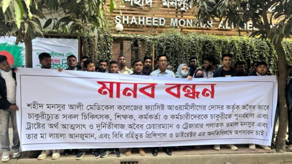 নিয়ম বহির্ভূত ভাবে চাকরিচ্যুত চিকিৎসক, শিক্ষক, কর্মকর্তা ও কর্মচারীদের অবিলম্বে পুনর্বহালের দাবিতে রাজধানীর উত্তরায় অবস্থিত শহীদ মনসুর আলী মেডিকেল কলেজের সামনে মানববন্ধন কর্মসূচি পালন করেছে ভুক্তভোগীরা। মঙ্গলবার (২৩ ডিসেম্বর )